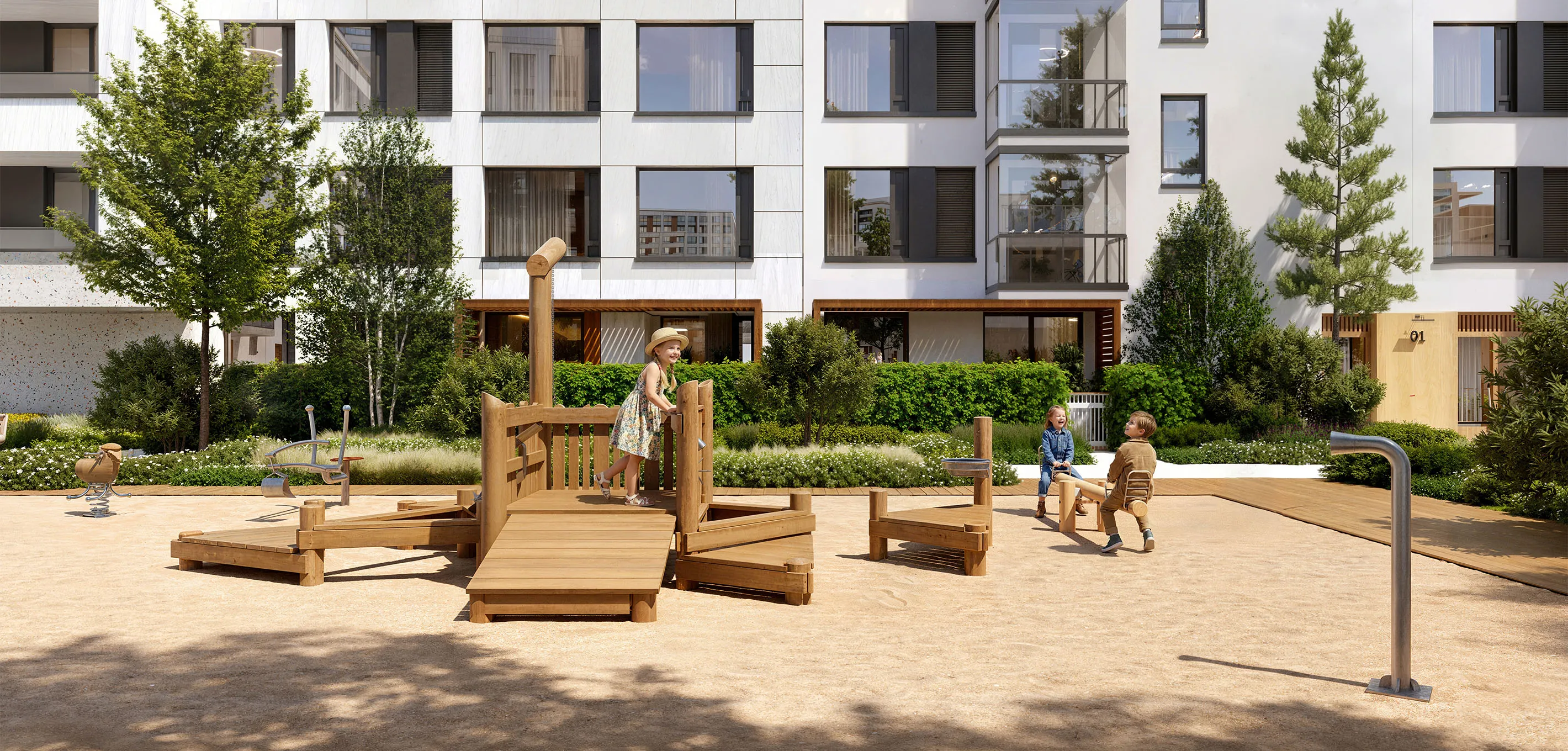 Со стороны парка на первых этажах домов спроектированы двухуровневые квартиры с отдельным входом, калиткой и собственным палисадником. Мы ратуем за безбарьерную среду и всячески пытаемся избавиться от любых препятствий. Но здесь специально добавили немного ступеней, чтобы увеличить степень приватности.